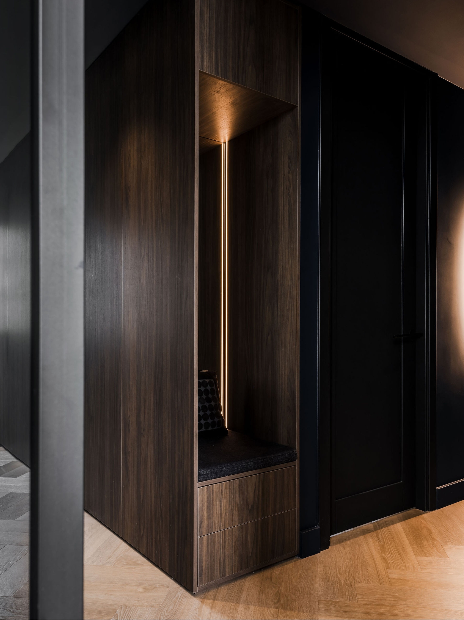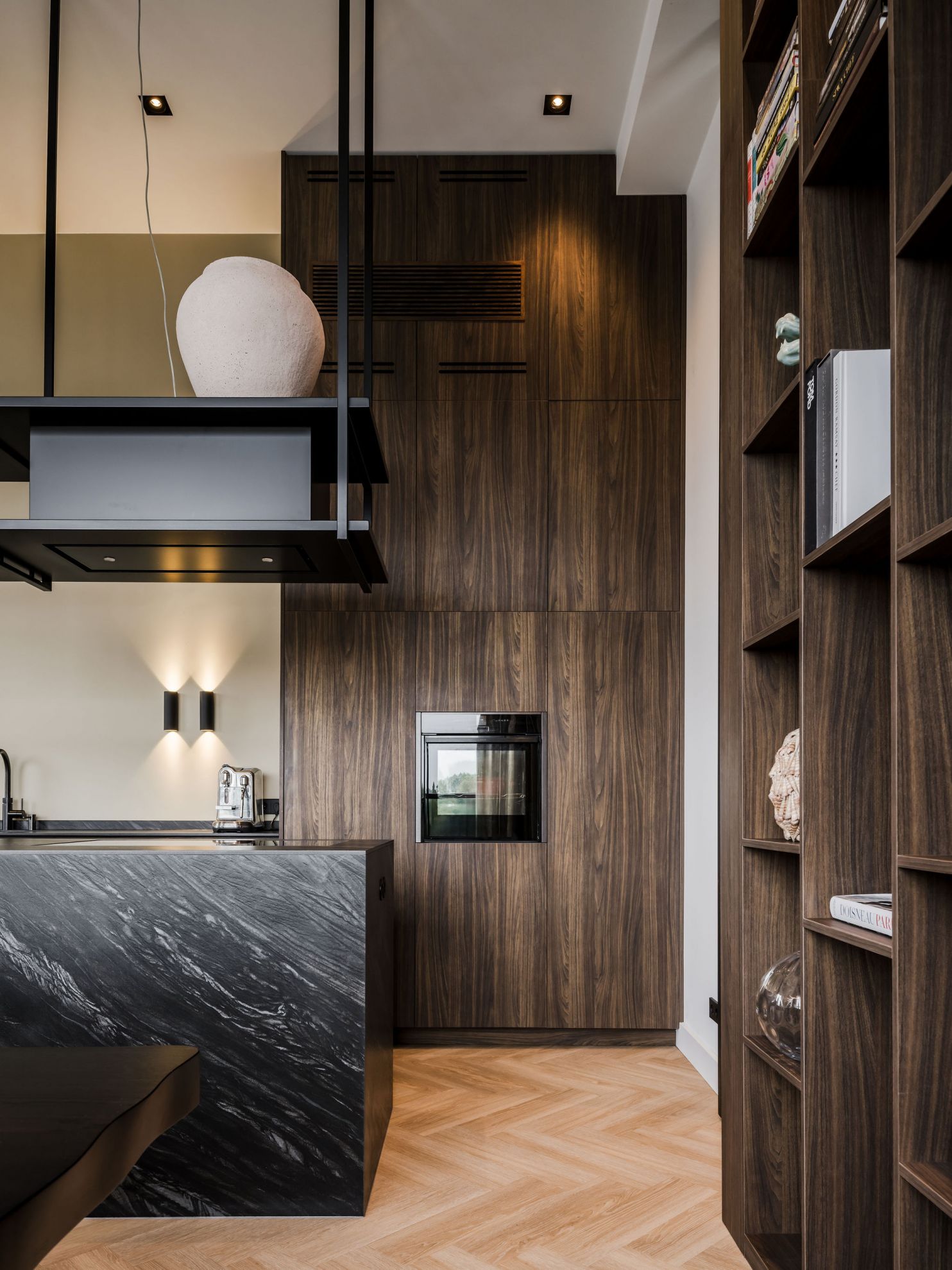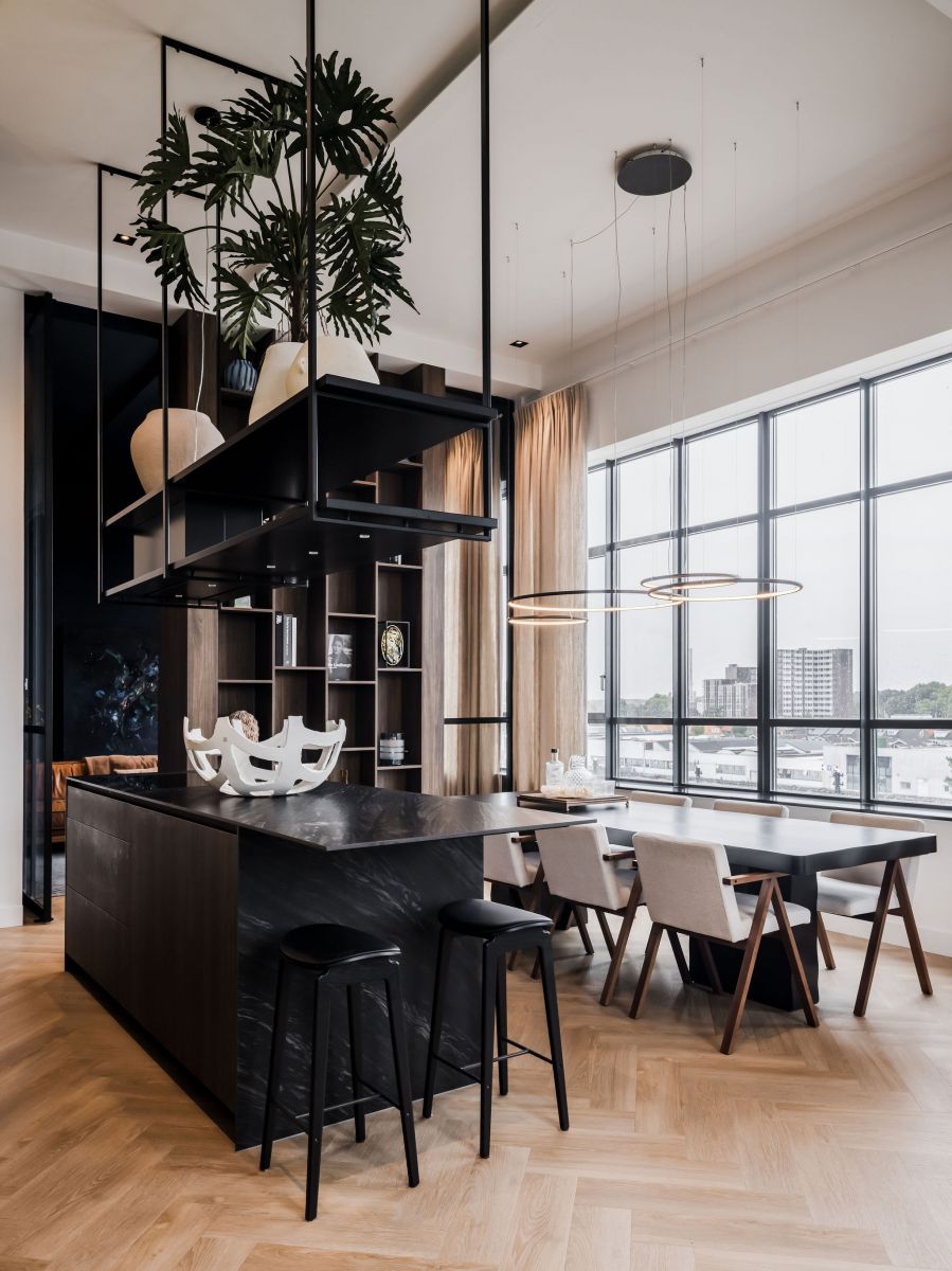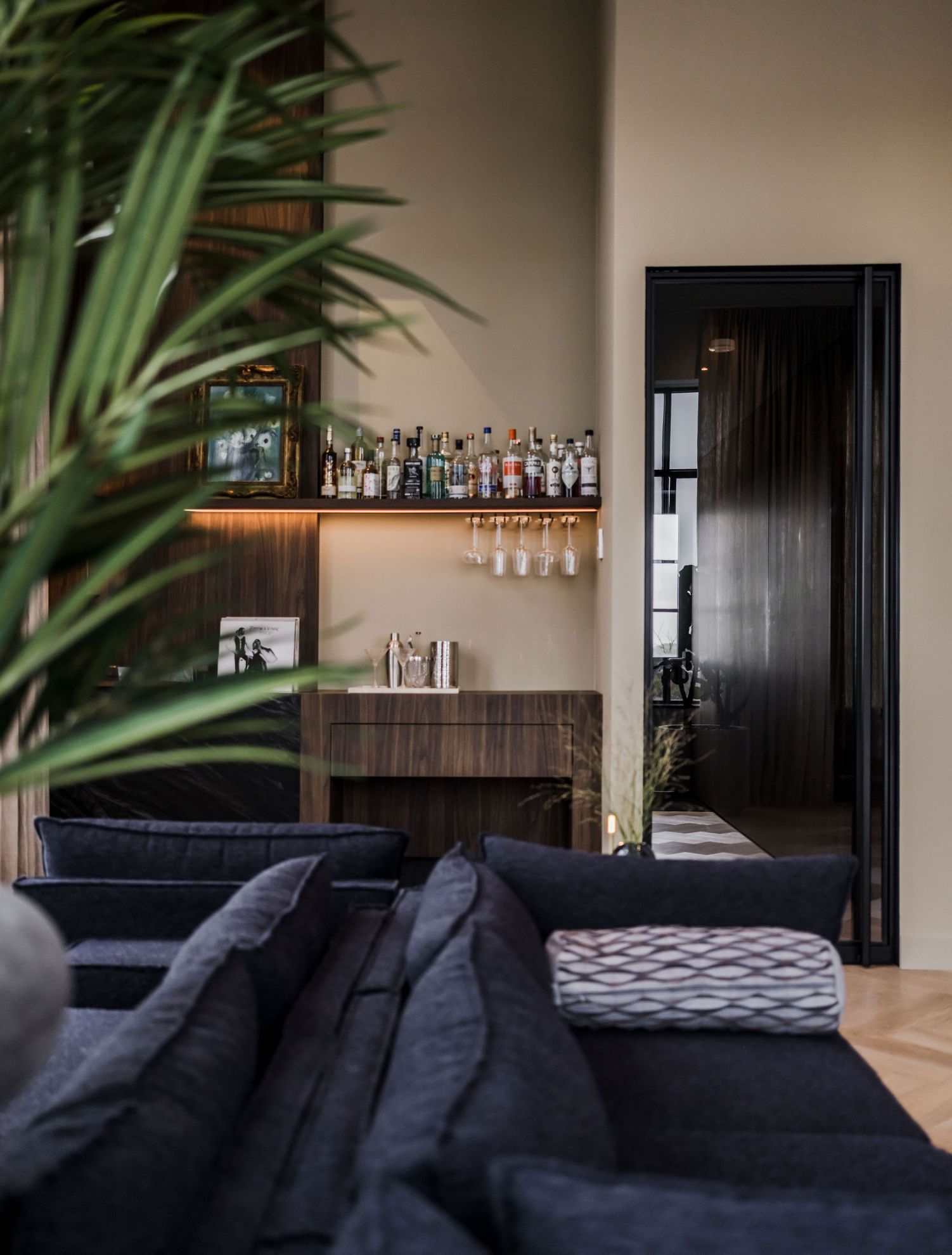 De entree is strak ontworpen met maatwerkmeubels en een afgewerkte houten wandbekleding. Van de donkere, intieme hal stap je de lichte, open woonkamer binnen: een echt wow-moment. De woonkamer heeft unieke eyecatchers, van een imposante kastenwand met twee plafondhoge taatsdeuren tot een rug-aan-rug sofa waar je vanuit elke hoek kunt genieten van cocktails tot je favoriete lp's. De keuken en eetkamer volmaken het geheel, met een royale zes-persoons eettafel en een hoge keuken die de ruimte op een spannende manier doorbreekt.