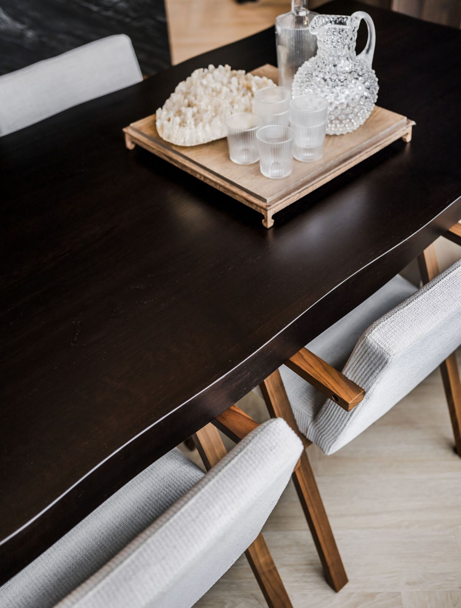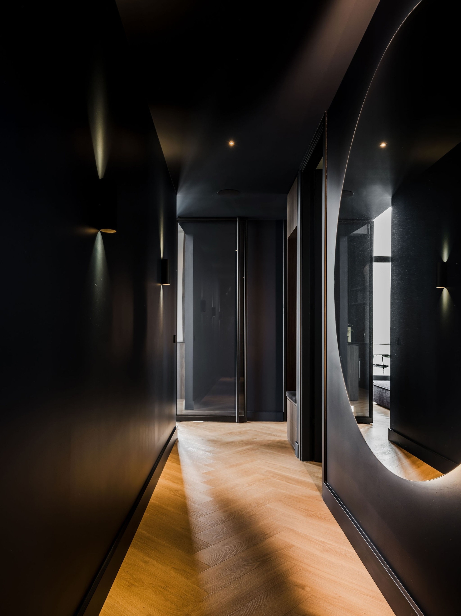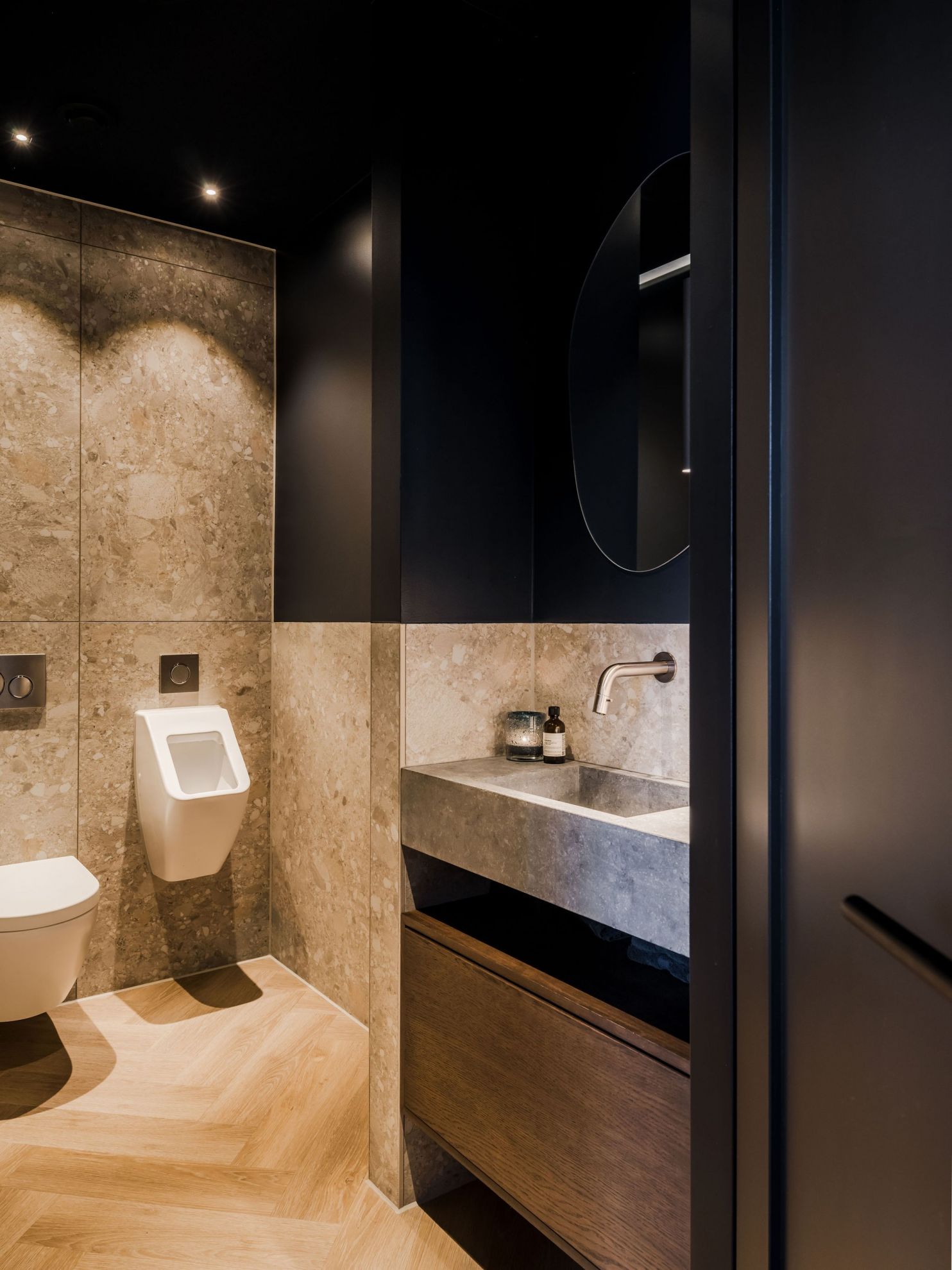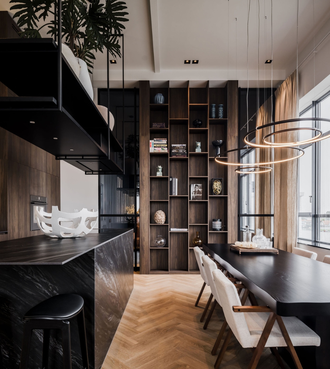 De entree is strak ontworpen met maatwerkmeubels en een afgewerkte houten wandbekleding. Van de donkere, intieme hal stap je de lichte, open woonkamer binnen: een echt wow-moment. De woonkamer heeft unieke eyecatchers, van een imposante kastenwand met twee plafondhoge taatsdeuren tot een rug-aan-rug sofa waar je vanuit elke hoek kunt genieten van cocktails tot je favoriete lp's. De keuken en eetkamer volmaken het geheel, met een royale zes-persoons eettafel en een hoge keuken die de ruimte op een spannende manier doorbreekt.