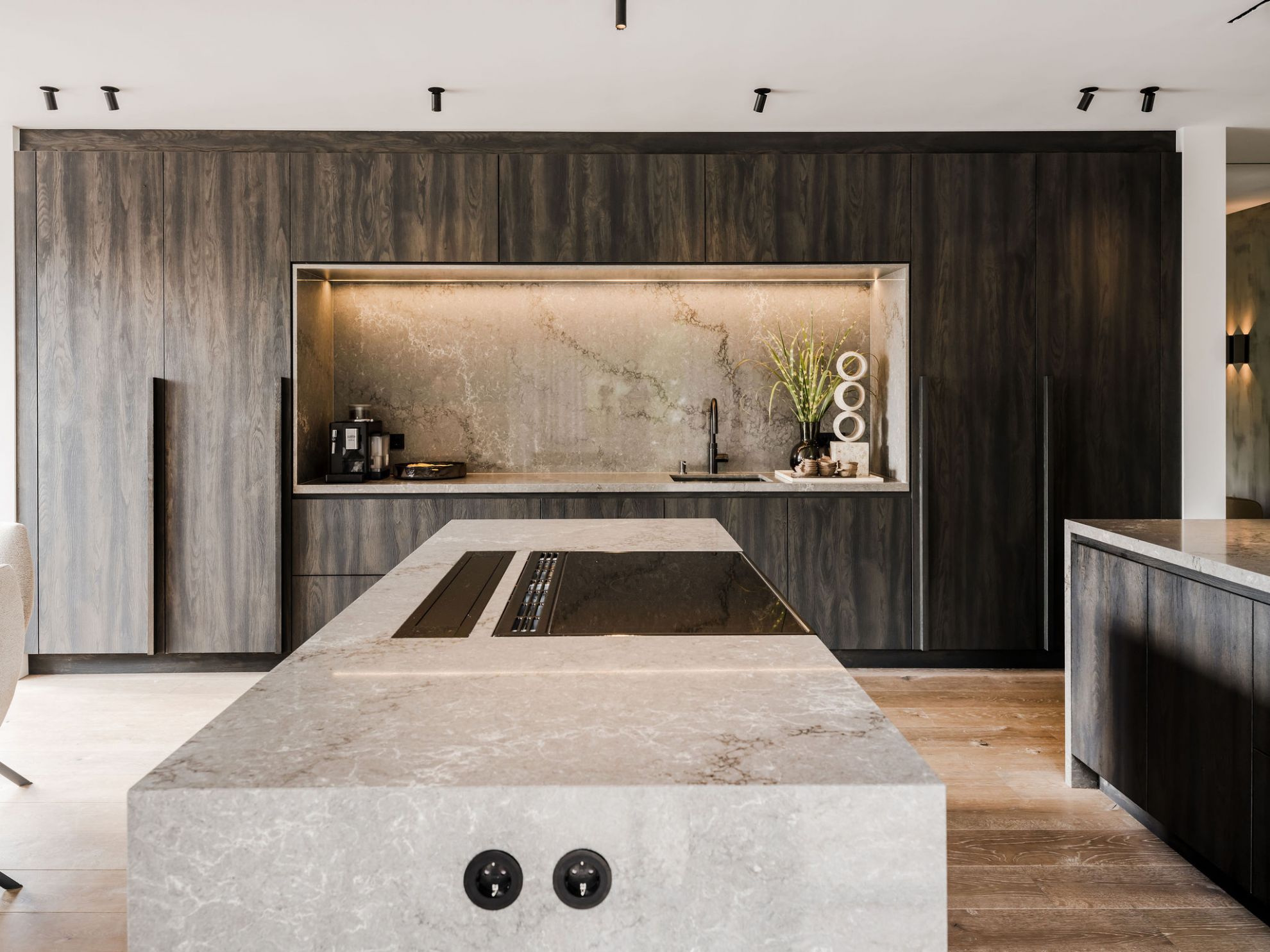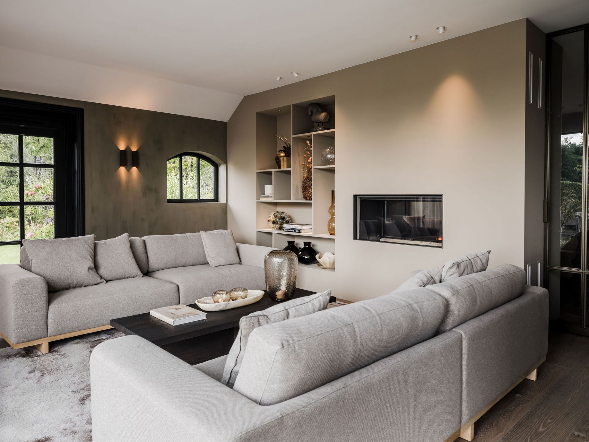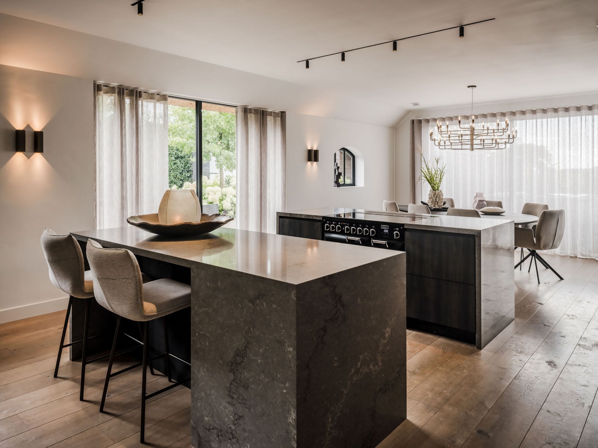 De dubbele woonkamer vormt het hart van het huis. Rond de centrale haard ontstaat een natuurlijke verdeling tussen intimiteit en openheid. De royale keuken sluit daar naadloos op aan: ontworpen voor de echte keukenliefhebber.