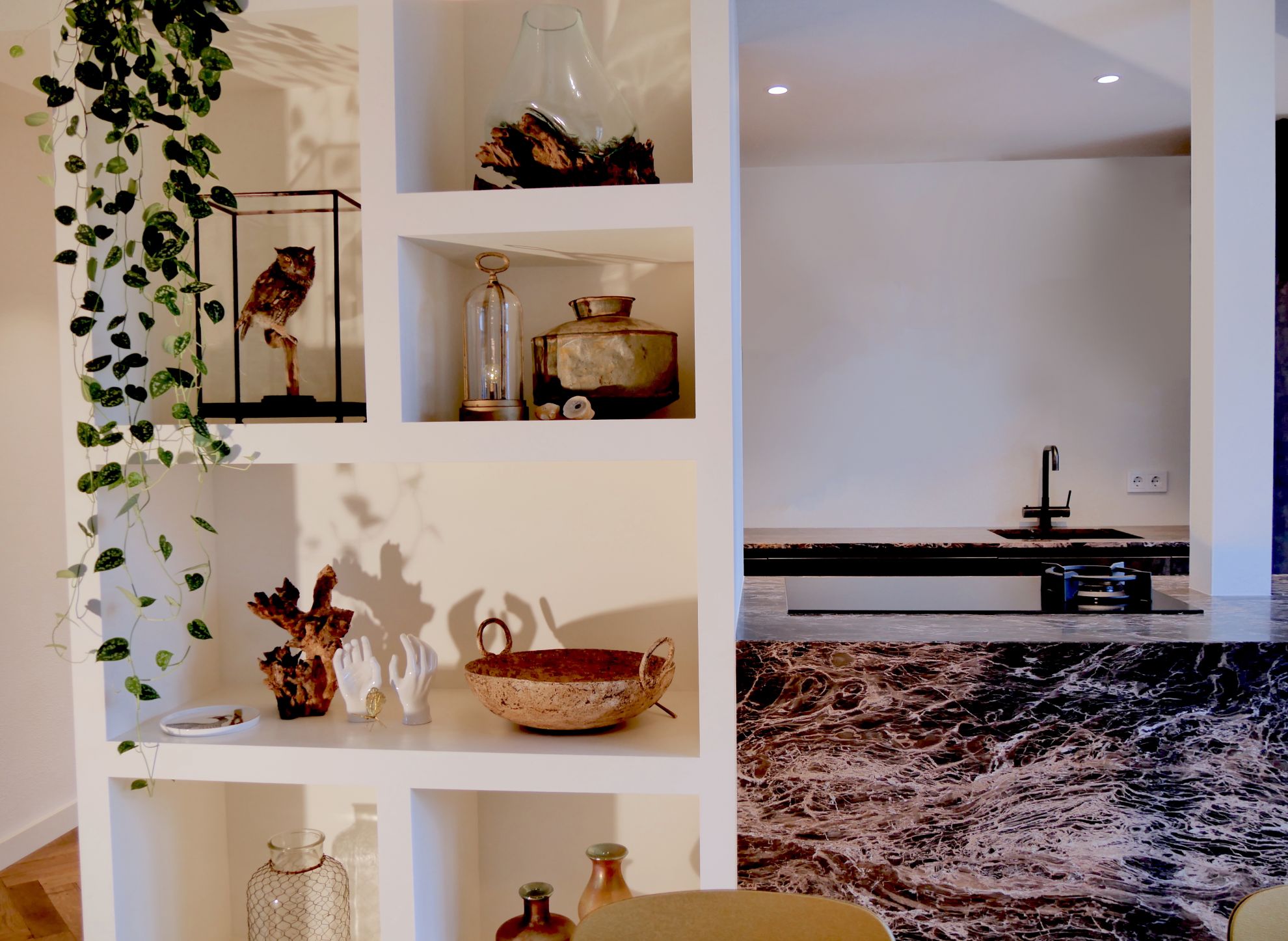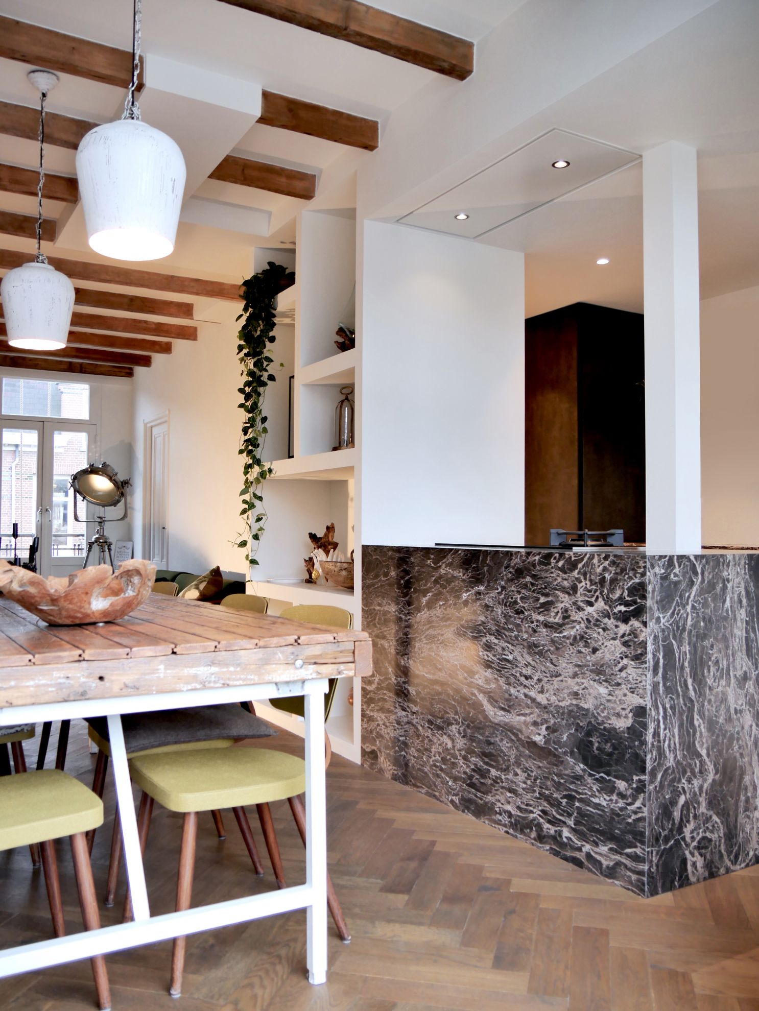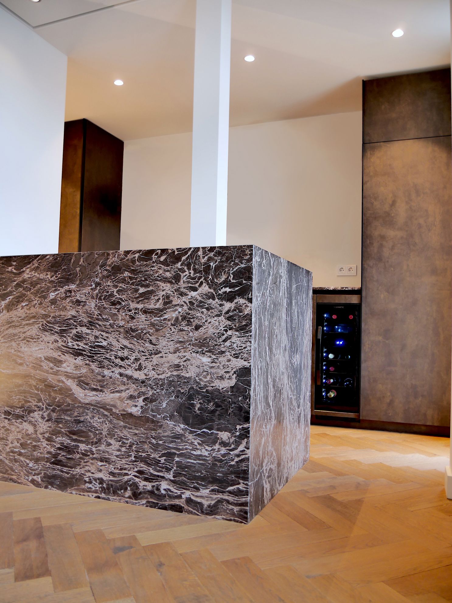 De draagmuur tussen de keuken en woonkamer is weggehaald en op deze plek is er een massief marmeren keuken-schiereiland gemaakt die volledig in contact staat met de woonkamer.